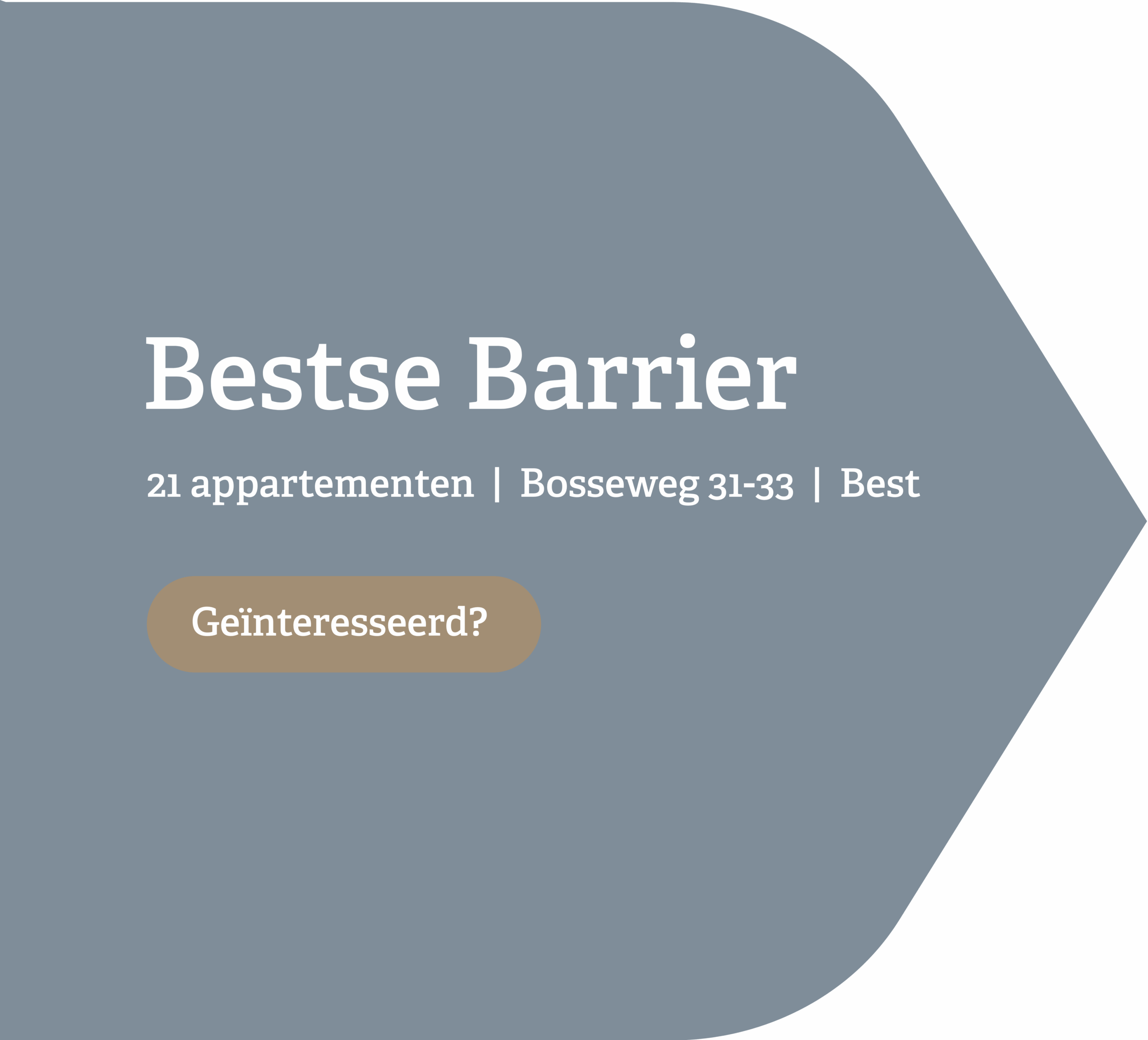 Aan De Bosseweg 31 en 33 op de locatie van de voormalige antiekwinkel “Isphording” komen 21 gelijkvloerse appartementen samen in twee gebouwen. Verbonden door een pergola en slanke brug. Een entree die meteen iets bijzonders uitstraalt. Achter de gevels ontdek je zes woningtypen van 42 tot 67 m², elk met een mooie living, een slaapkamer aan de galerijzijde, een badkamer met apart toilet en een ruime berging. 6 appartementen hebben de luxe van een 2e slaapkamer. Door de buitenruimte aan de achterzijde van de Bestse Barrier te leggen profiteer je maximaal van de zon en rust op je balkon of tuintje.
